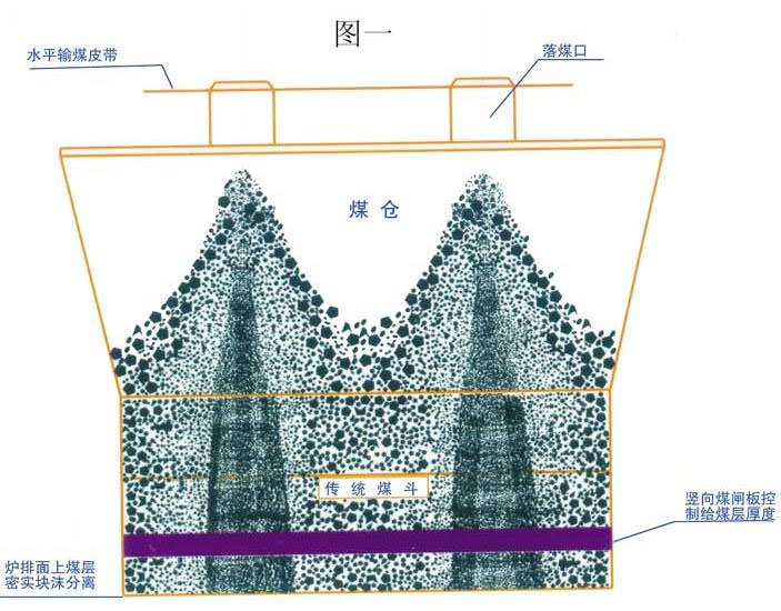 正轉(zhuǎn)鏈條鍋爐送風特點是沿爐排長度方向上分段送風,沿爐排寬度方向上等壓送風。采用機械聯(lián)合輸送上煤方式的大噸位鍋爐,煤從輸煤皮帶上落入煤倉過程中自然堆積成“山”字,在爐排寬度方向上形成塊、沫自然分離,進入爐排后局部全部為塊煤,通風阻力小而形“火口”,局部全部為沫煤,通風阻力大而形成“黑帶”,噸位越大,爐排越寬,煤層越厚,“火口”和“黑帶”現(xiàn)象越嚴重。給煤方式形成煤炭塊、沫分離導致煤層通風阻力不均,與正轉(zhuǎn)鏈條鍋爐分段等壓送風特點不相適應,是導致燃燒工況惡化,浪費能源的根本原因(如圖一)。