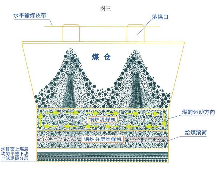 鍋爐混煤機是針對機械聯(lián)合輸送上煤方式鍋爐,單獨使用鍋爐分層給煤器效果不好其原因(如圖二),近年來研發(fā)的產(chǎn)品,其作用相當于建筑用砂漿攪拌機,將由輸煤皮帶上自然下落進入煤倉形成塊、沫分離的煤進行攪拌混合,根據(jù)單位時間煤耗量利用變頻器調(diào)整轉(zhuǎn)速,使塊、沫和干、濕度(配套均勻加水裝置)充分混合均勻。